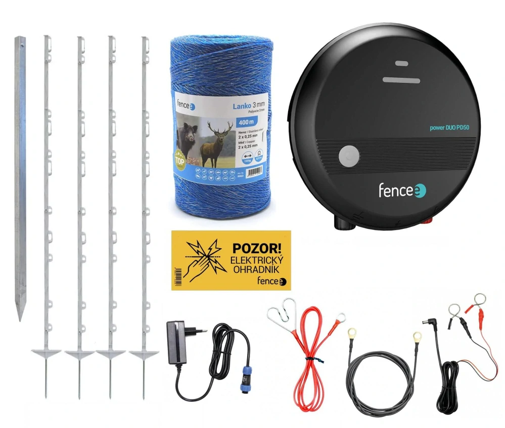 Základem setu je kombinovaný generátor fencee power DUO PD50 s výkonem 5 J, ten je spolehlivou volbou i pro delší ohrady s možnou délkou instalace až 40 kilometrů. Kombinovaný generátor můžete napájet pomocí adaptéru ze sítě 230 V nebo z klasické autobaterie 12 V. Tu využijete také jako záložní zdroj v případě výpadku elektrického proudu.